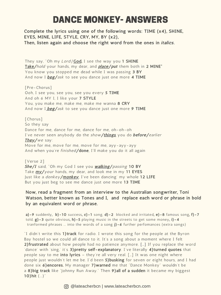. Dance Monkey By Tones And I Song Meanings And Facts Dance Monkey English Esl Worksheets For Distance Learning And Physical Classrooms Dance Monkey Worksheet